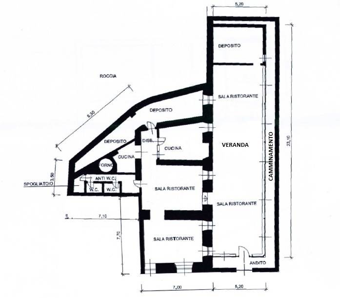 Il locale principale è diviso sulle due ampie sale ristorante, con la cucina ed il forno per le pizze, i doppi servizi e spogliatoio, ed un abbondante deposito.
