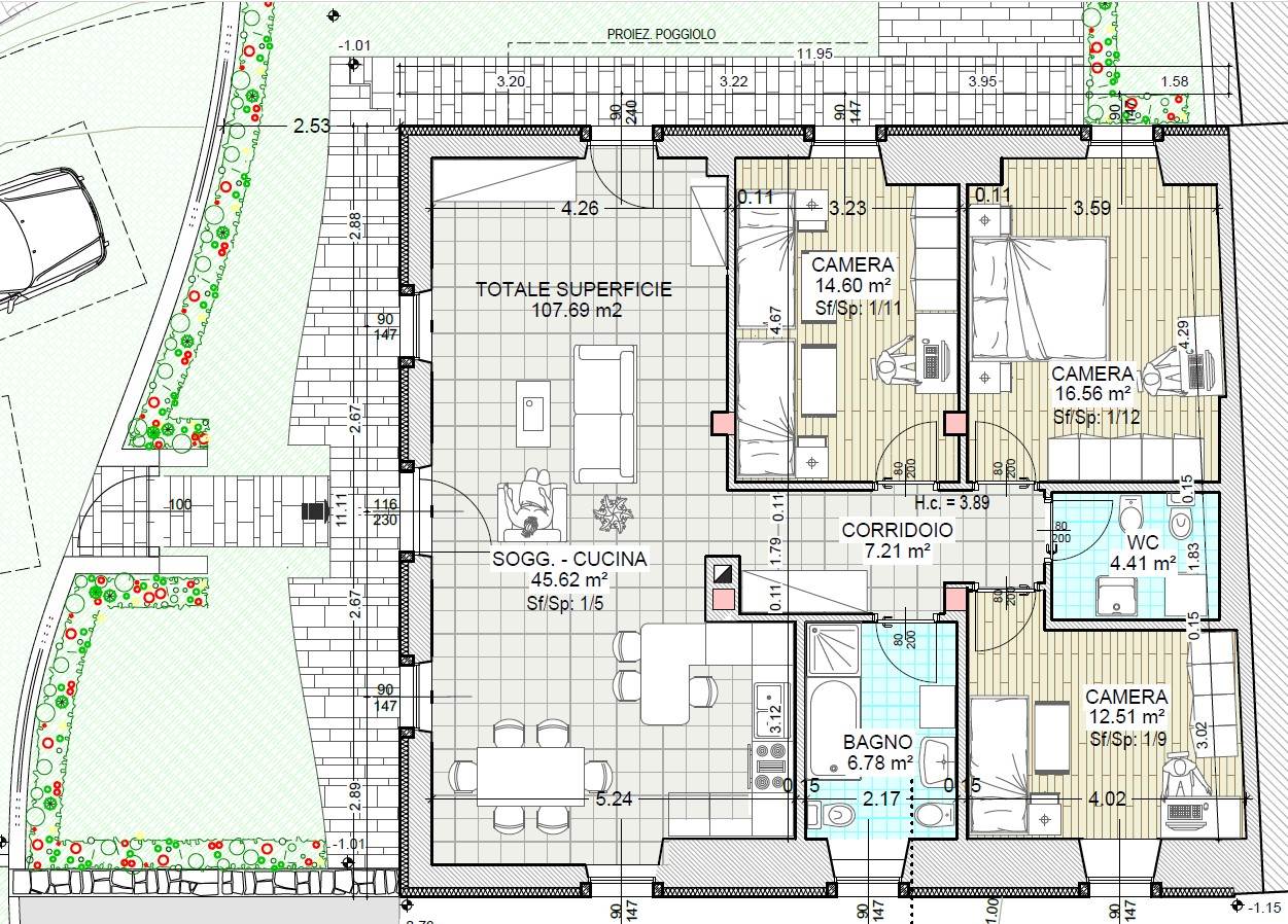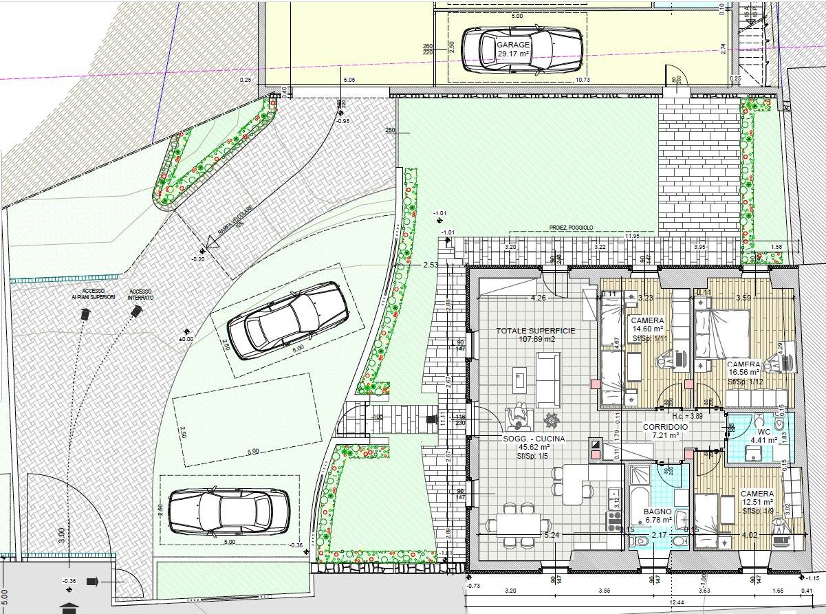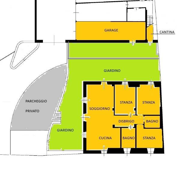 Appartamento a piano terra, libero sui 3 lati, con dimensione di 107 mq utili con ingresso indipendente, ampio soggiorno con angolo cottura di 45 mq, disbrigo, tre stanze da letto (due matrimoniali di 16mq e 14 mq, e una doppia di 12 mq), doppi servizi. Giardino privato di 135 mq (con una piccola servitù) disposto sui due lati dell’appartamento. Garage doppio di 29 mq utili disposto in lunghezza con accesso diretto al giardino privato e comoda cantina sottoscala, oltre ad un abbondante spazio (50 mq) di parcheggio privato per 2-3 automobili di fronte alla casa.